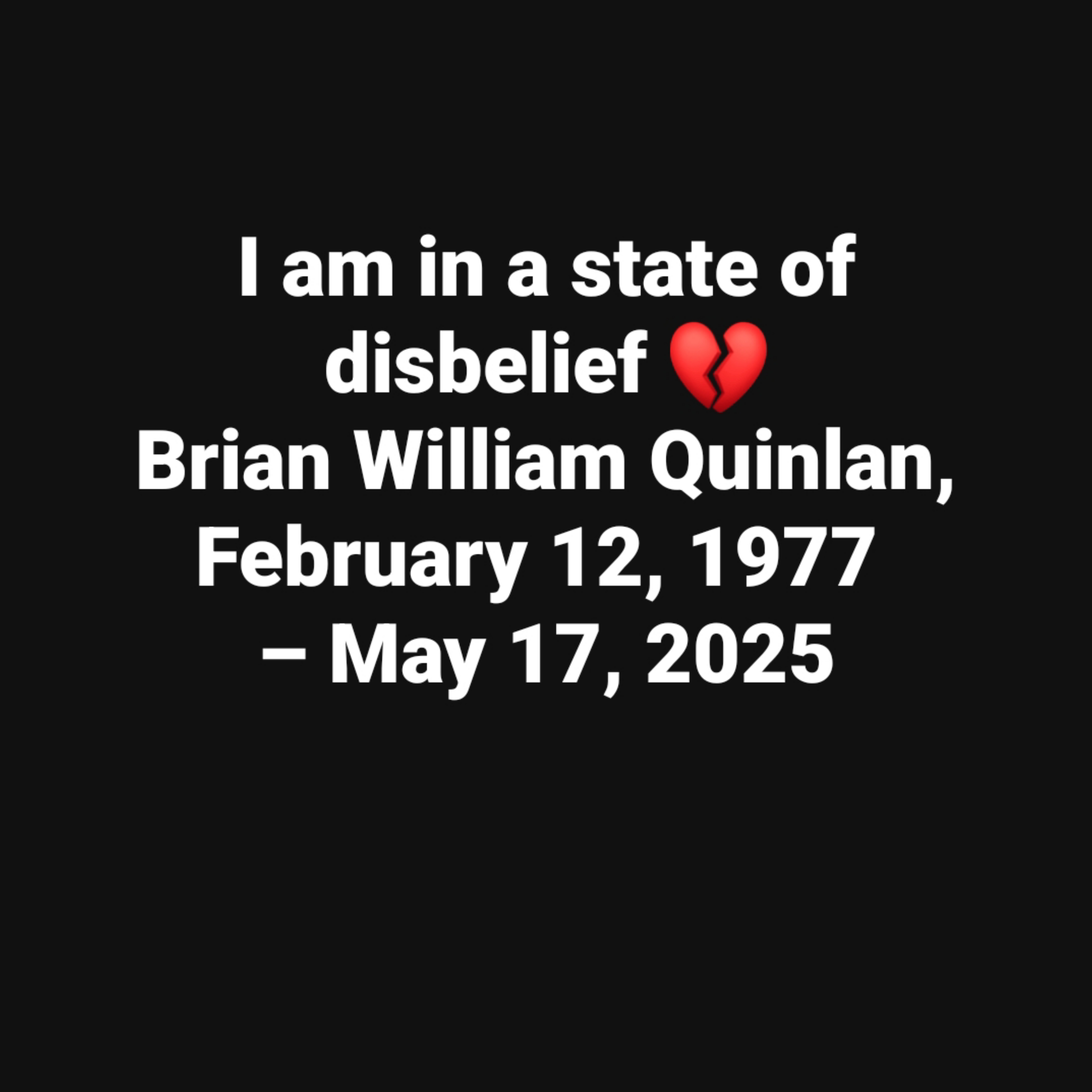 “I want to thank everyone for all the love I have received after losing my younger brother. I’ve seen all the condolences & I am forever grateful to you all. Rest in Power Brian.” Brian William Quinlan, February 12, 1977 – May 17, 2025 https://www.robinsonfuneralhome.com/obituaries/brain-quinlan